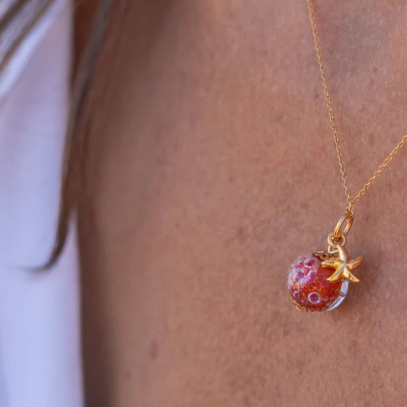 Perle de verre artisanale avec des bulles, fabriquée à la main dans le Golfe du Morbihan, accompagnée d'une pampille étoile de mer et d'un collier en argent 925 doré 0,5 microns 18 carats, 45 cm, avec pampille LouPi.
