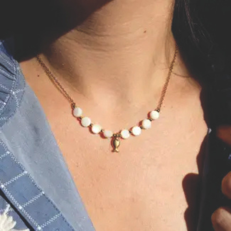 Taille : environ 40 cm et 5 cm d’extension. Ce collier se ferme par un mousqueton traditionnel. Métal Acier. Inoxydable hypo-allergène ou plaqué en Or 18 carats, perles de nacre et poisson en métal plaqué 24 carats ou Argent.