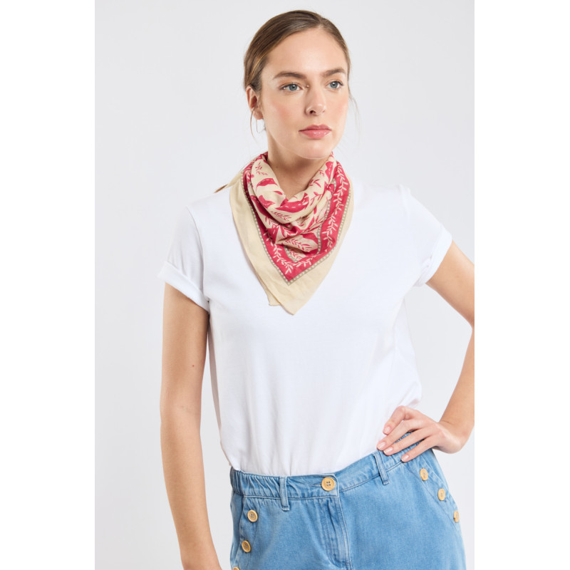 Pour finaliser un joli look, on craque pour ce foulard en coton aux motifs printaniers.