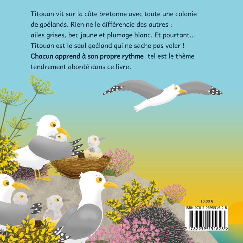 Titouan vit sur la côte bretonne avec toute une colonie de goélands. Rien ne le différencie des autres : ailes grises, bec jaune et plumage blanc. Et pourtant... Titouan est le seul goéland qui ne sache pas voler !