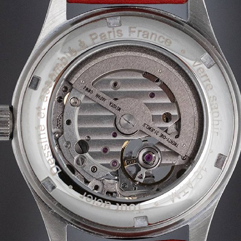 Diamètre - épaisseur (mm) 39 - 11. Etanchéité 100 mètres. Type de mouvement : Automatique « Cœur ouvert » MIYOTA 8250. Boitier : Acier. Verre Minéral avec protection saphir. Fond Vissé en verre avec mouvement apparent. Lunette Fixe. Bracelet : Cuir véritable avec pompe flash.