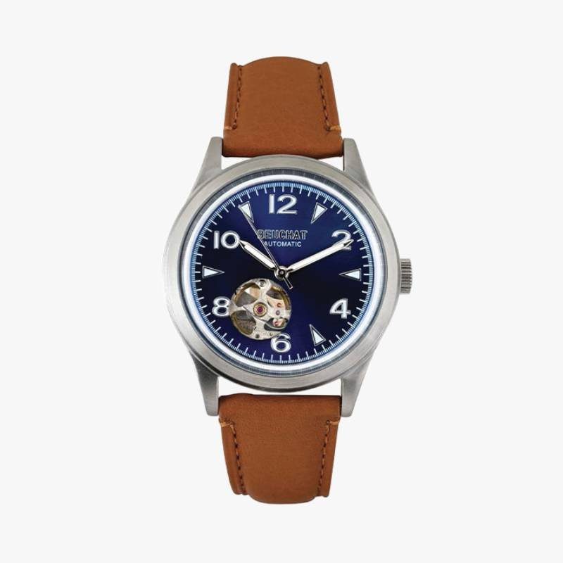 Une montre élégante au mécanisme automatique visible, alliant style raffiné et savoir-faire horloger français.