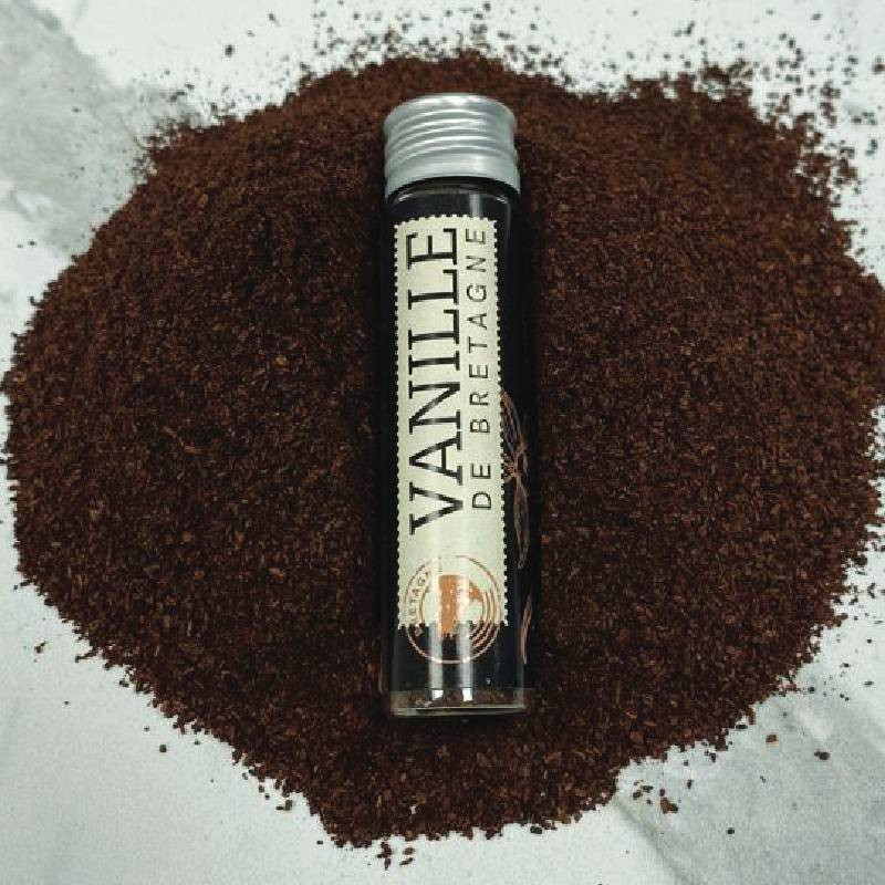 Gousse de Vanille de Bretagne Planifolia, séchée puis broyées entière (cosse + graine à l’intérieur), ce qui lui donne une puissance aromatique remarquable.
